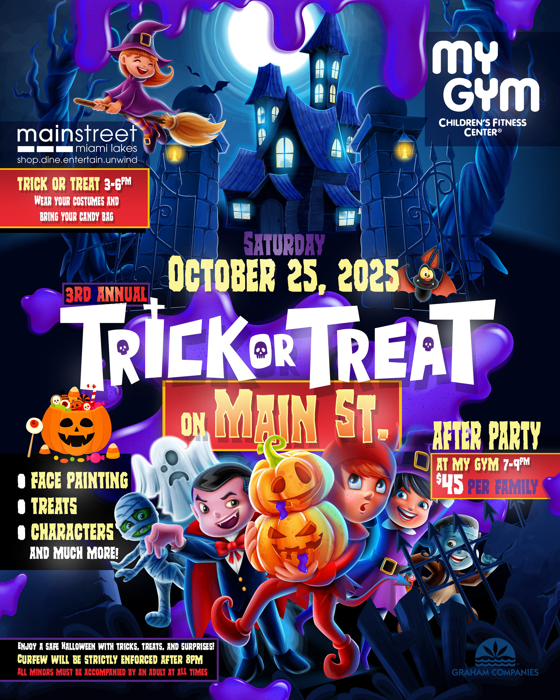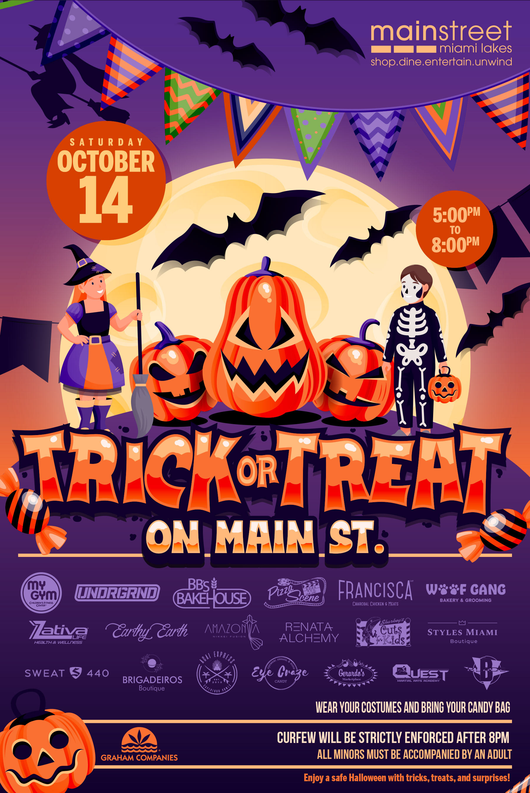 Long-term creative partnership with The Graham Companies, the developers of Miami Lakes. Designed the Halloween Trick or Treat on Main Street branding three years in a row, bringing fresh visuals to one of the town’s biggest annual events. Also designed and printed custom signage for their offices and residential properties, keeping their branding consistent across the community.